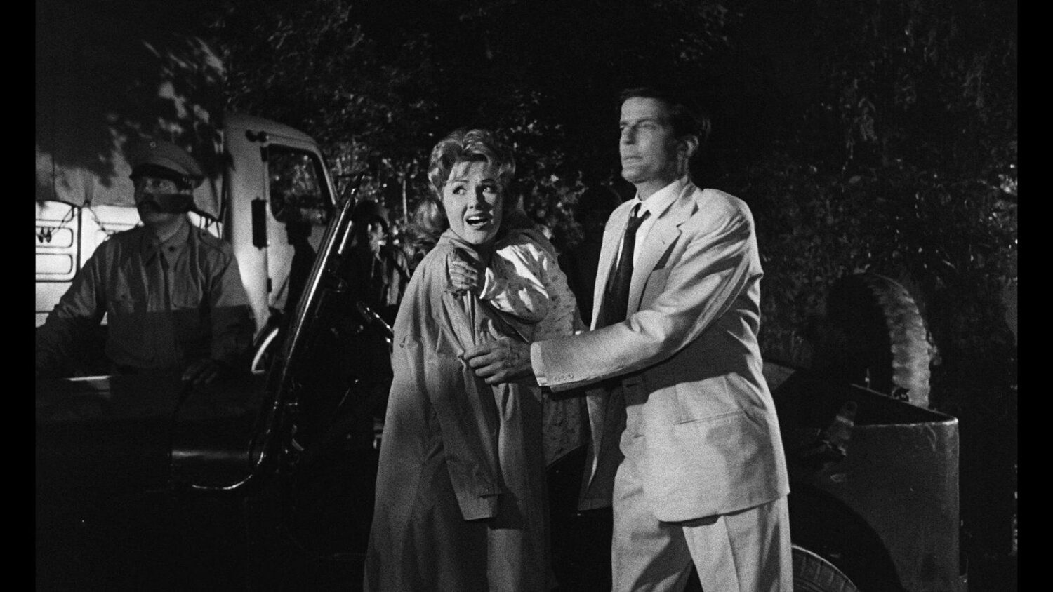 Daneben weist der Film eine große Dichte an unterschiedlichen Erzählebenen auf. Im Camp wohnen wir auch einer Art Voodootanz der guatemaltekischen Supporter bei, mit einem erotischen Touch (Exotik und Tanz scheinen ein wiederkehrendes Motiv bei Bava zu sein, s. DIE RACHE DER WIKINGER). Und, wichtiger, die Beziehungsverstrickungen der Protagonistinnen und Protagonisten werden auch gleich als kaum lösbar eingeführt. Nach einem Streit von Professor John Fielding (John Merivale) mit seiner Frau Ellen (Didi Sullivan) macht sich der ungestüme Max Gunther (Gerhard Haerter) an Ellen heran. Er blitzt ab, denn an dieser Ehe wird es nichts zu rütteln geben. Zwischen Ellen und Max steht auch ein Klassenunterschied. Dafür zerstört Max gleich darauf die Avancen des Halbbluts Linda (Daniela Rocca), indem er sie auf die ethnischen Unterschiede verweist: „Such dir ein Halbblut!“ Nicht nur werden damit in CALTIKI Klasse und Ethnie Treiber der menschlichen Probleme, das Drehbuch identifiziert auch Max so sehr als Störenfried einer klassenloseren Ordnung (die Fieldings verstehen sich überaus gut mit Linda), dass er das Menschheitsproblem mit Caltiki auch auf individualpsychologischer Ebene spiegelt.