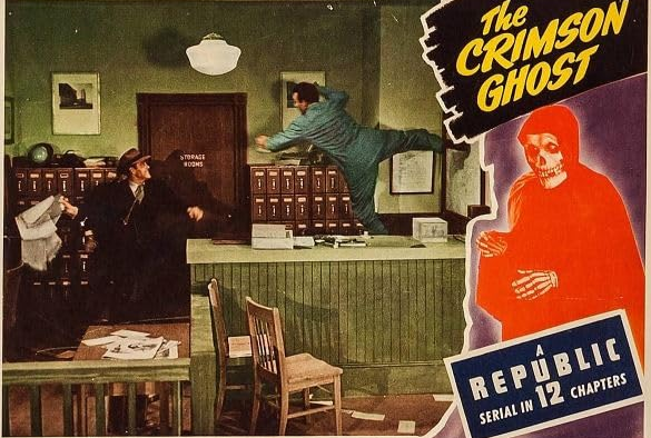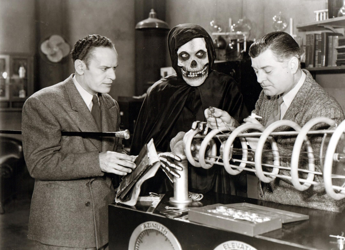 Zum ersten Mal, seit die Bombe auf Hiroshima fiel, könne er wieder ruhig schlafen, sagt einer der Professoren, an deren Campus sich das Schicksal der Welt erfüllt und deren Gremium eine Art Ältestenrat bildet, in THE CRIMSON GHOST (DER MANN MIT DER TOTENMASKE, 1946). Er sagt es, nachdem sein Kollege Chambers seine neue Erfindung vorgestellt hat: Die Zyklotrode X kann die Funktion sämtlicher Maschinen und Motoren neutralisieren und sogar eine Atombombe außer Kraft setzen, somit als erste Verteidigungswaffe gegen einen Atomangriff auf die USA dienen.