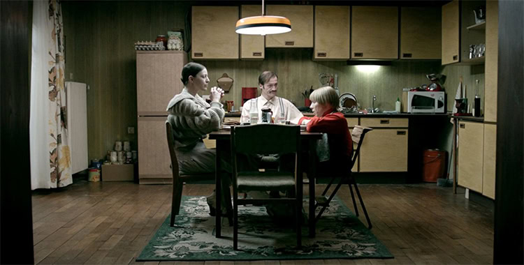 Ironischerweise führt DER BUNKER – zumindest was die Ausstattung betrifft, eine genaue zeitliche Zuordnung findet nicht statt – zurück in die Blütezeit des deutschen Films, in die Zeit der analogen Telefone mit ihren gelochten Wählscheiben, von mechanischen Schreibmaschinen, mit geometrischem Mustern bedruckter Tapeten und geknüpfter Teppiche. Diese Welt entdeckt ein namenloser Student, als er bei einer Familie ein ruhiges Plätzchen für seine Studien zu finden sucht. Das ruhige Plätzchen befindet sich abseits der Zivilisation halb unter der Erde in einem Wald, und auch seine Bewohner scheinen aus der Zeit gefallen. Der Vater stolziert mit überheblichen Gockelgehabe eines Zirkusdirektors herum. Sein Sohn Klaus ist ein erwachsener anmutender Achtjähriger mit Lernschwäche. Die Mutter als feuchter Traum eines jeden Reaktionärs sorgt sich um den Haushalt und sucht ihre Erfüllung im Kochen. Man kommt überein, dass der Student für die Bildung des Jungen sorgen soll, um so für die Zimmermiete aufzukommen. So beengt die Verhältnisse auch sind, so groß sind die Ambitionen des Vaters, der aus seinem schweigsamen, verschüchterten Sohn einmal den „Präsidenten“ machen möchte. Dafür scheint es zunächst auszureichen, dass Klaus die Hauptstädte aller Länder auswendig weiß. Lernfortschritte werden von den Eltern täglich kontrolliert, Misserfolge mit Prügel bestraft. Und Klaus erweist sich als sehr lernresistent.